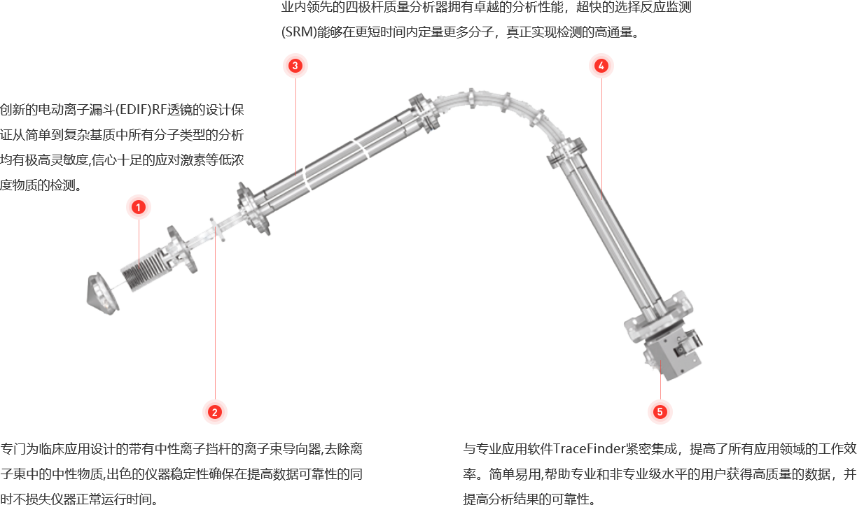 在离子传输部件上RZ-500有三大独特设计:第一、高容量离子传输管(HCTT)设计,HCTT传输管采用了mm口径的大椭圆形开口,在维持高效的脱溶剂作用的同时将更多的离子传输进入质谱系统,提高信号强度;第二、电动离子漏斗设计,离子漏斗由一系列不锈钢片组成,对于由HCTT传输管中输入的大量离子具有极高的传输效率和极好的聚焦能力,同时由于离子漏斗的独立一体化设计以及不锈钢材质,可以简单方便地把离子漏斗进行拆卸和清洗;第三、弯曲的离子東传输组件加上中性粒子挡杆的设计,质谱离子化时会产生一些中性粒子,这些中性粒子如果进入离子通道,会造成质谱图的噪音干扰,并且极易污染整个离子光学通道,将传输四极杆设计成弯曲通道,并在上方加上中性粒子阻挡杆的设计,带电离子可以受电场影响发生偏转通过传输四极杆,而中性离子不受电场影响不发生偏转湮灭在中性粒子阻挡杆上,避免进入四极杆质量分析器。