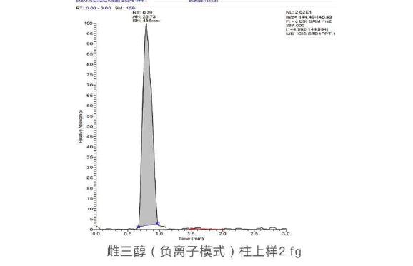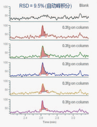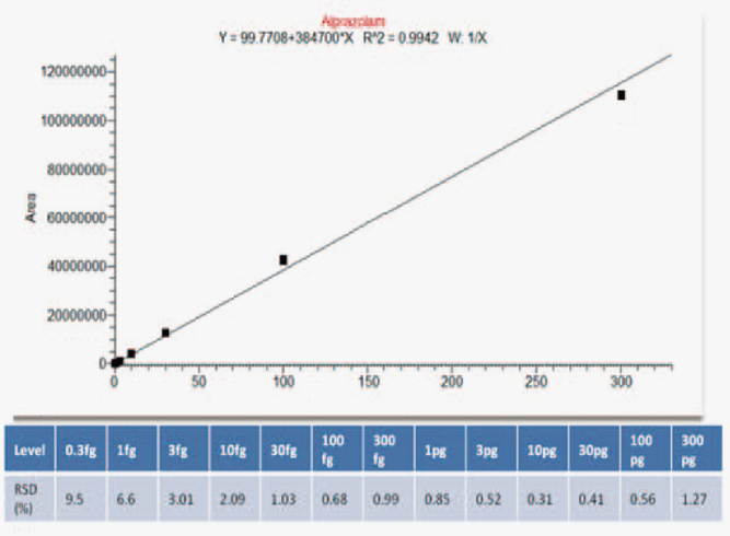 RZ-500的AIM技术保证整个三重四极杆系统具有超高的灵敏度和宽线性范围。以阿普唑仑为例,在上样量低至0.3fg时,5次进样自动积分RSD为9.5%,线性范围达到6个数量级。