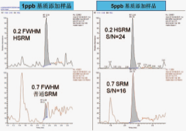 RZ-500采用了双曲面四极杆,四极场分布与理论四极场无偏差,最高分辨率可达到0.2 Da FWHM。分辨率对于分析那些基质复杂、干扰大的样品尤为重要。右图为奶粉基质中添加双氰胺检测,可以看到在普通分辨率下进行SRM扫描时,色谱峰中存在明显的基质干扰,影响定量的检测限和精度,而在高分辨模式下,即使浓度低至1 ppb,也可以得到非常干净的谱图,进行精确的检测和定量分析。
