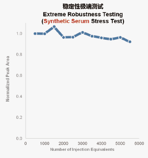 RZ-500的弯曲离子束传输组件和中性粒子档杆设计使得系统具有极好的耐用性,使用人血清复杂基质样品对系统进行极端耐用性测试,在多达6000次进样之后,RZ-500仍能够保持良好的信号强度和稳定性。