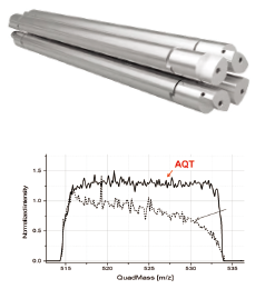 RZ-500上使用的四极杆是大口径分段式、共轭双曲面四极杆,半峰宽最低可以设定到0.2 Da FWHM。分段式四极杆分成Pre-filter、主四极杆和Post-filter三段,Pre和Post-filter部分仅加射频电压,可有效的去除边缘场效应提高离子传输效率,从而提高灵敏度。同时质量范围上限高达2000 Da,对某些质量数超大的单电荷化合物有独一无二的优势。